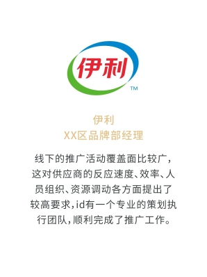 i-d先后經歷與Audi、Mercedes-Benz、infiniti、PORSCHE、可口可樂、麥當勞、肯德基、Budweiser、華為、小米、中國移動、ELLE、L'OREAL、萬達、仁恒置地、恒大、碧桂園、蘭桂坊...的業務合作,成功地將國際化的營銷策劃理念及執行方式融入本土,為更多的中國企業開啟全新的品牌推廣思路和執行方案。